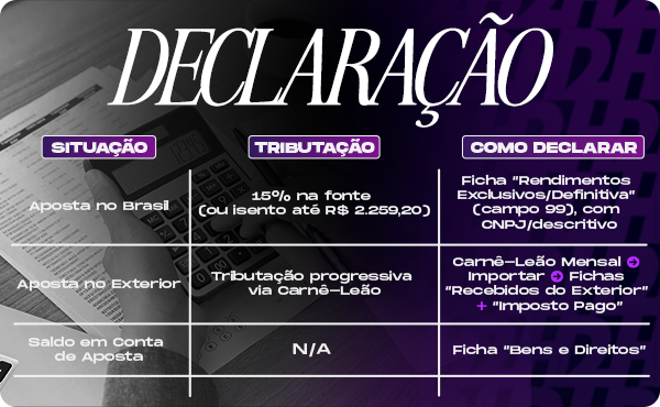 Se você se enquadra em qualquer uma dessas faixas, a entrega da declaração é obrigatória, mesmo que já tenha ocorrido a retenção do imposto na fonte pela casa de apostas.